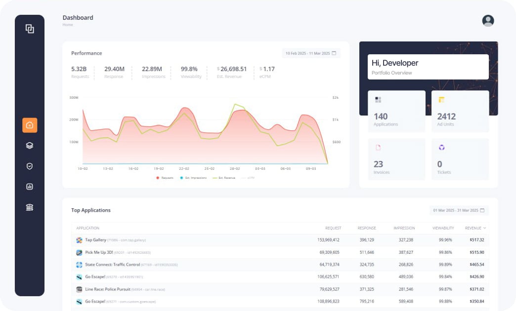 Our Al-driven technology is designed to fuel monetization growth for web and app publishers. Experience transparent and scalable growth with endless monetization opportunities in just one click.